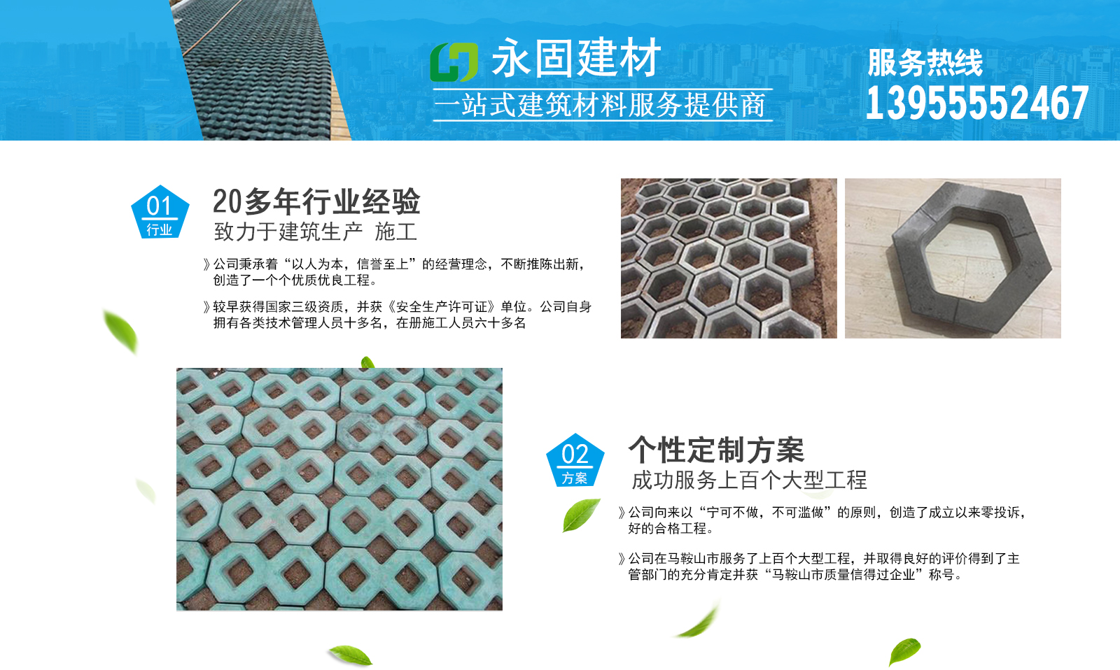 馬鞍山市永固建材有限公司,成立于一九九六年六月。公司秉承著“以人為本,信譽至上”的經(jīng)營理念,不斷推陳出新,創(chuàng)造了一個個優(yōu)良工程。較早獲得國家三級資質(zhì),并獲《安全生產(chǎn)許可證》單位。公司自身擁有各類技術(shù)管理人員十多名,在冊施工人員六十多名,公司向來以“寧可不做,不可濫做”的原則,創(chuàng)造了成立以來零投訴,好的合格工程。得到了主管部門的充分肯定并獲“馬鞍山市質(zhì)量信得過企業(yè)”稱號。我們從戰(zhàn)略高度審視市場,創(chuàng)造性開展各項工作,在建筑裝飾行業(yè)中,力爭做到人無我有,人有我精,在保證硬件實施的同時,注重軟件環(huán)境的建設(shè),按現(xiàn)代企業(yè)制度的要求,樹立誠信的企業(yè)理念,推進企業(yè)的管理向系統(tǒng)化、正規(guī)化、制度化邁進;為創(chuàng)造好的企業(yè)、優(yōu)異的效益、好的管理打下堅實的基礎(chǔ)。我們把企業(yè)的發(fā)展、回報客戶和社會當做首要務(wù),我們追求優(yōu)良品質(zhì),將以至誠至美的團隊協(xié)作精神誠信服務(wù),竭誠為廣大客戶提供完善的服務(wù)。